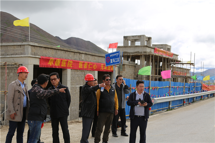 2018年了8月9日,受阜康邀請(qǐng),西藏自治區(qū)政協(xié)副主席、區(qū)工商聯(lián)主席、區(qū)總商會(huì)會(huì)長(zhǎng)阿沛·晉源,拉薩大昭寺管家洛桑,西藏自治區(qū)社會(huì)科學(xué)院原處長(zhǎng)次旺仁青,西藏阜康醫(yī)療股份有限公司黨委書(shū)記、董事長(zhǎng)王斌,西藏阜康醫(yī)療股份有限公司黨委副書(shū)記、副總經(jīng)理陳彬,西藏阜康醫(yī)院名譽(yù)院長(zhǎng)嘎布,阜康生殖醫(yī)學(xué)中心實(shí)驗(yàn)室主任劉鋒,阜康體檢中心主檢師瓊瑪,阿沛·晉源主席秘書(shū)旦增一行早上8點(diǎn)從拉薩出發(fā),一路顛簸馳騁于下午2點(diǎn)50分許抵達(dá)那曲地區(qū)嘉黎縣夏瑪鄉(xiāng)。聽(tīng)說(shuō)晉源主席要來(lái)視察衛(wèi)生院的建設(shè)工作,嘉黎縣縣長(zhǎng)吾金不顧受傷的左腿帶領(lǐng)當(dāng)?shù)馗刹咳罕娫缭绲群蛟谙默斷l(xiāng)衛(wèi)生院建設(shè)現(xiàn)場(chǎng)。